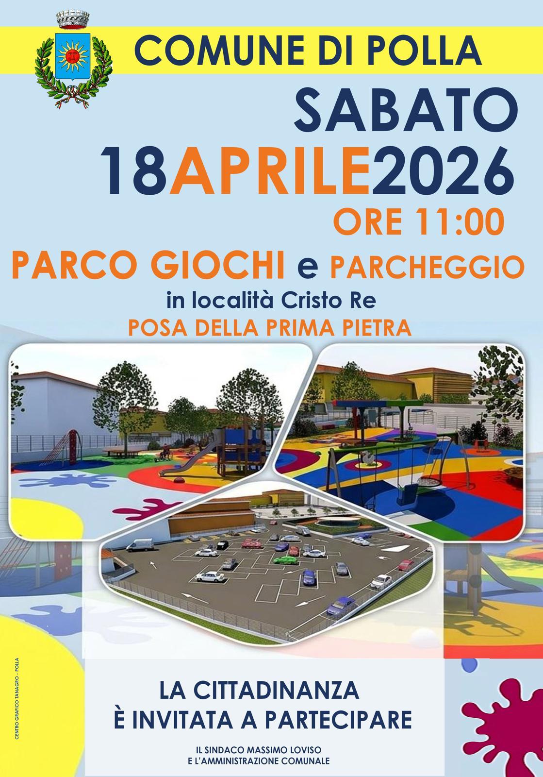 Il Comune di Polla è lieto di annunciare alla cittadinanza la cerimonia di posa della prima pietra per la realizzazione del nuovo parco giochi e parcheggio in località Cristo Re. L'evento si terrà sabato 18 aprile 2026 alle ore 11:00 e rappresenta un importante passo avanti per il miglioramento degli spazi pubblici e dei servizi dedicati alle famiglie e ai bambini.